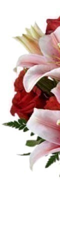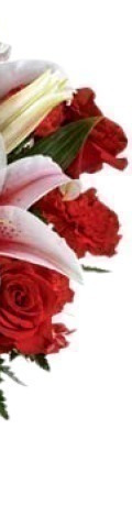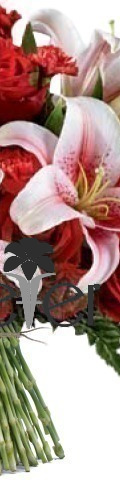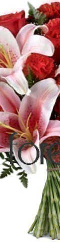 6 Pink Stargazer Lilies, 6 Red Roses, 6 Red Carnations, Green Ferns