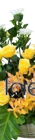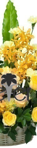 14 Yellow Roses, 10 cream carnations, yellow mokkara orchids - basket