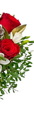 6 Red Roses, White Freesia, Pinecones
